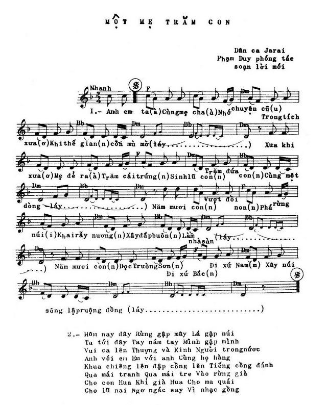 Trong tuyển tập này có 3 bài dân ca Jarai và hồi nhỏ tui được biết và được dạy hát cả 3 bài. Có lẽ nhiều bạn miền Nam cùng thời cũng vậy. Đó lần lượt là các bài dân ca Một mẹ trăm con, Chiêng trống cồng và Anh mau về.